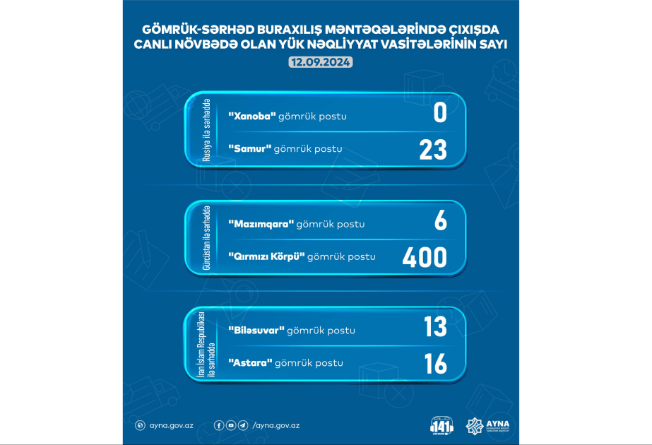 Gömrük-sərhəd məntəqələrində çıxışda gözləmədə olan nəqliyyat vasitələrinin sayı barədə məlumata əsasən, “Samur” gömrük postunda 23, "Mazımqara" gömrük postunda 6, "Biləsuvar" gömrük postunda 13, Astara" gömrük postunda isə 16 yük avtomobili gözləyir.